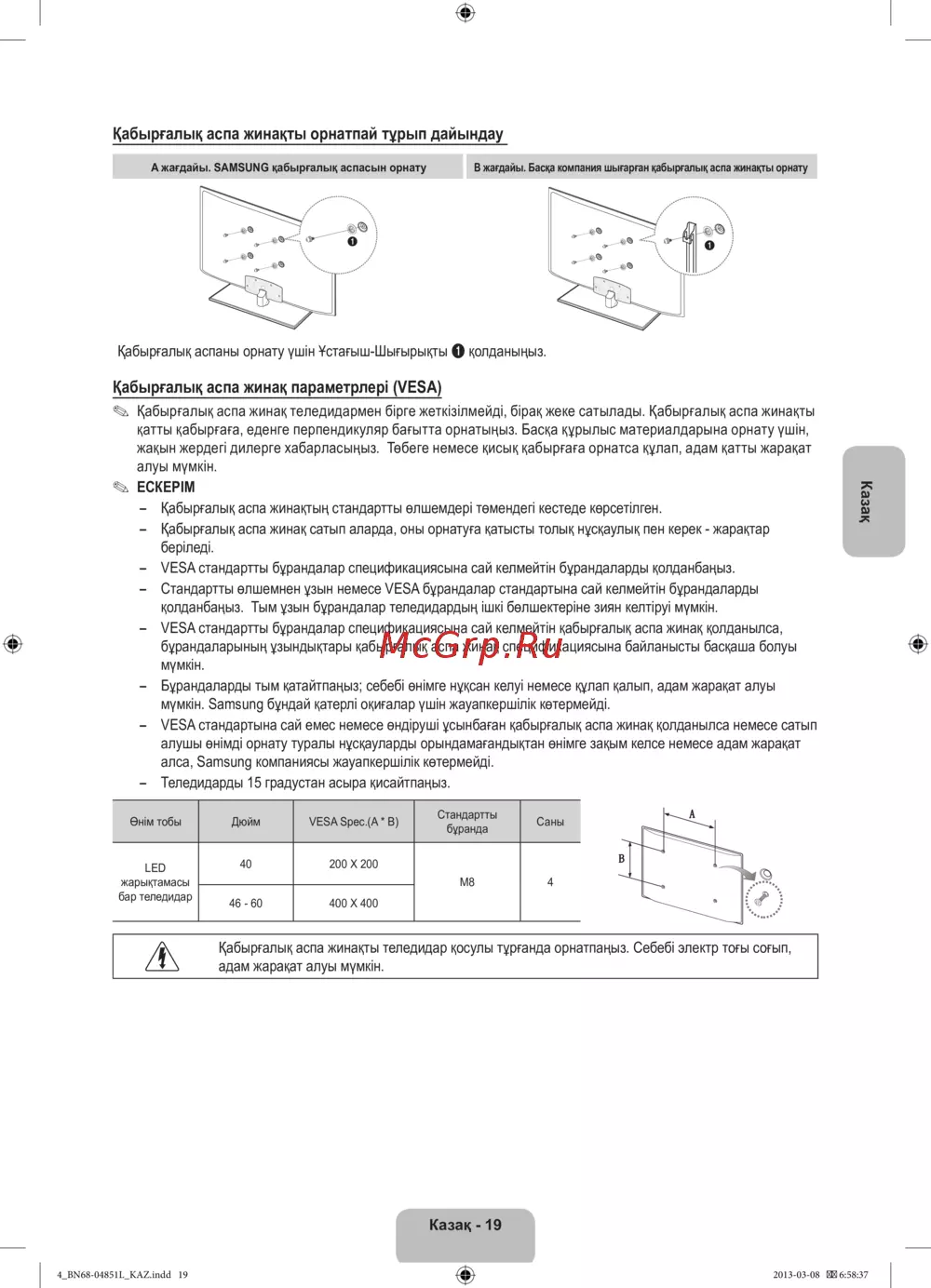 - Қабырғалық аспа жинақ параметрлері vesa p.88