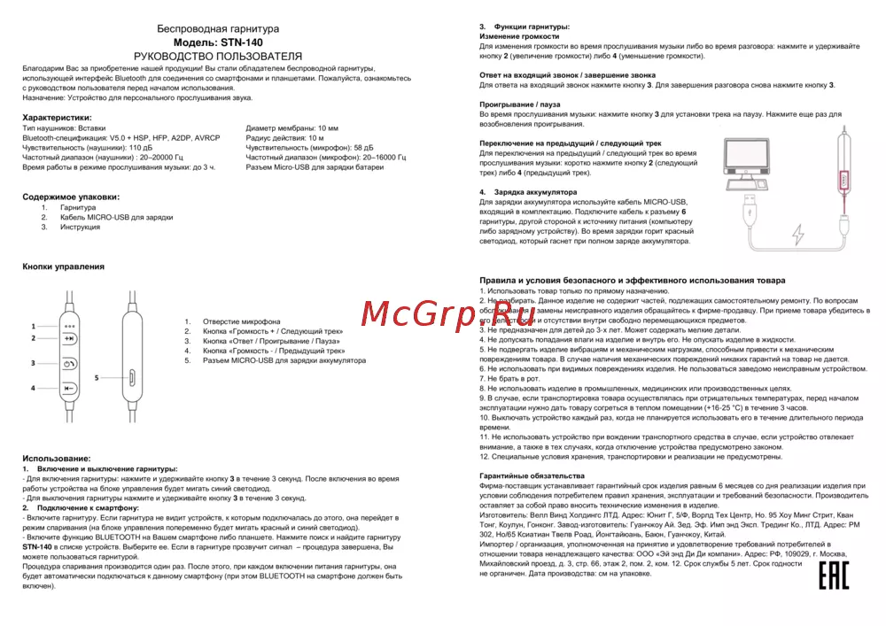 Время работы в режиме прослушивания музыки: до 3 ч. Разъем Micro-USB для зарядки батареи