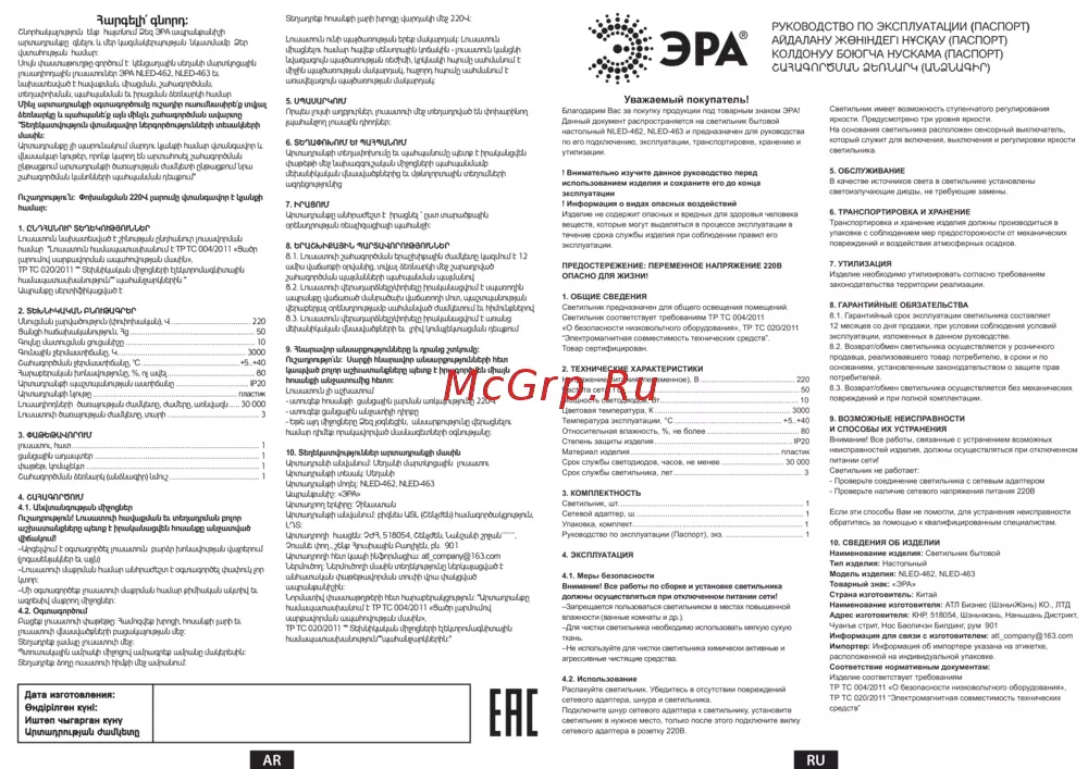 - Эра атындагы соода тобунун иштеп чыгарган продукциясын сатып алганыныз ү ч ү н жана биздин соода тобуна болгон ишиеними ң из ү ч ү н чо ң ыраазычылыгыбызды билдиребиз аталган документ кийинкилерге тийишт үү тиричиликтеги ү ст ө лг ө коюлуучу жарыкдиоддик эра шамчырактары nled 462 nled 463 жана чогултуу туташтыруу колдонуу жеткир үү сактоо жана утилизация боюнча нускамага багытталган буюмду колдонуудан мурда бул нускаманы кылдаттык менен изилдеп чыгы ң ыз жана колдонуу учурунда сактап кою ң уз бул шамчырактын коопту таасирлери ж ө нунд ө кенен маалымат эгерде бул буюмдун колдонуу эрежелери сакталса анда бул иштелип чыккан буюм адамдын ден соолугуна зыян жана кооптуу таасирин алып келбейт уулуу заттарды б ө л ү п чыгарбайт p.2