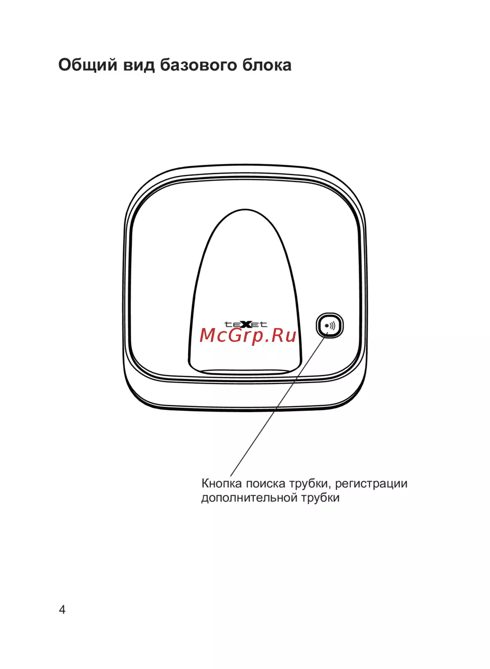 Общий вид базового блока Кнопка поиска трубки регистрации дополнительной трубки 4