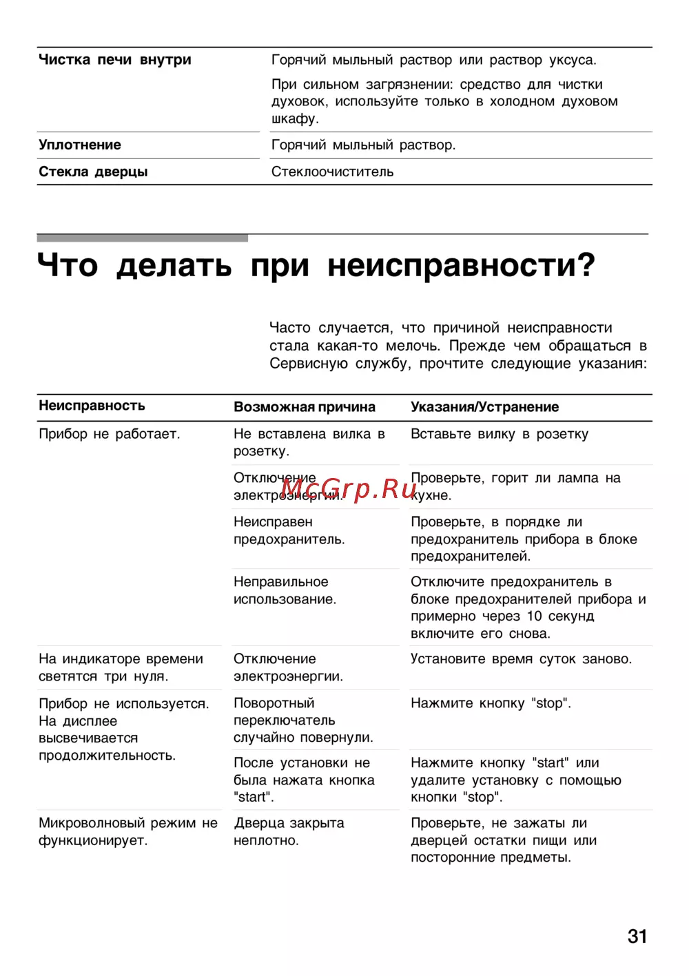 Чистка печи внутри Горячий мыльный раствор или раствор уксуса При сильном загрязнении средство для чистки духовок используйте только в холодном духовом шкафу Уплотнение Горячий мыльный раствор Стекла дверцы Стеклоочиститель Что делать при неисправности Часто случается что причиной неисправности стала какая то мелочь Прежде чем обращаться в Сервисную службу прочтите следующие указания Неисправность Возможная причина Указания Устранение Прибор не работает Не вставлена вилка в розетку Вставьте вилку в розетку Отключение электроэнергии Проверьте горит ли лампа на кухне Неисправен предохранитель Проверьте в порядке ли предохранитель прибора в блоке предохранителей Неправильное использование Отключите предохранитель в блоке предохранителей прибора и примерно через 10 секунд включите его снова На индикаторе времени светятся три нуля Отключение электроэнергии Установите время суток заново Прибор не используется На дисплее высвечивается продолжительность Поворотный переключатель случайно повернули Нажмите кнопку stop После установки не была нажата кнопка start Нажмите кнопку start или удалите установку с помощью кнопки stop Микроволновый режим не Дверца закрыта функционирует неплотно Проверьте не зажаты ли дверцей остатки пищи или посторонние предметы 31