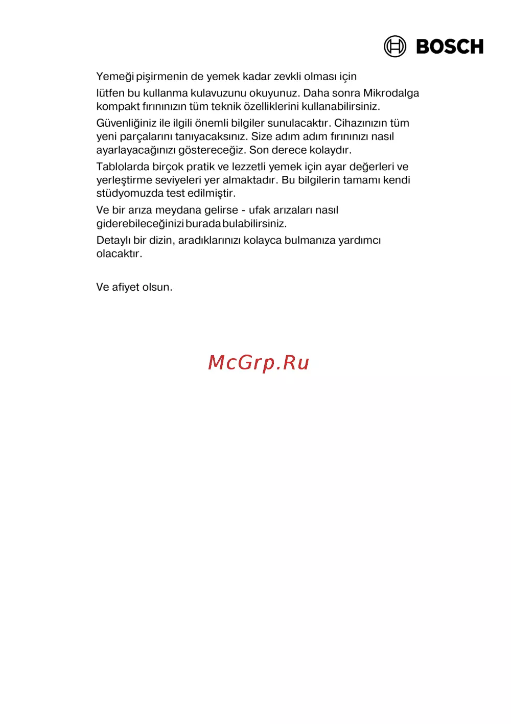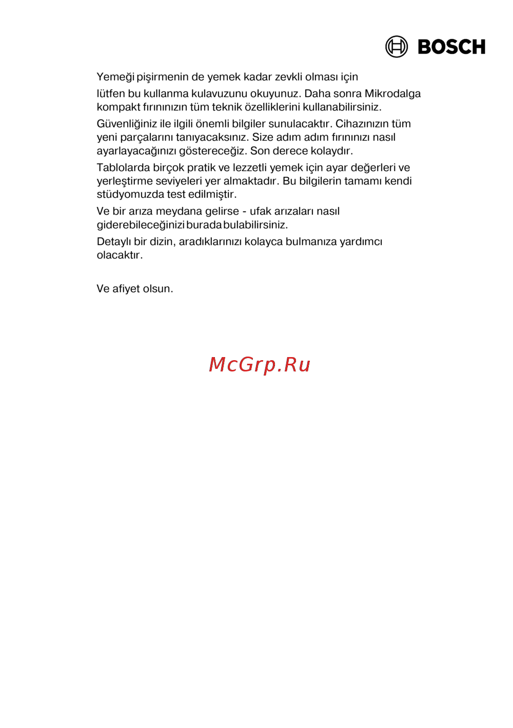 BOSCH Yemegi pisirmenin de yemek kadar zevkli olmasi icin lutfen bu kullanma kulavuzunu okuyunuz Daha sonra Mikrodalga kompakt fin ni nizin tum teknik ózell iklerini kullanabi lirsiniz Guvenliginiz ile ilgili ònemli bilgiler sunulacaktir Cihazimzin tum yeni parcalanm taniyacaksimz Size adim adim finninizi nasil ayarlayacagimzi gòsterecegiz Son derece kolaydir Tablolarda bircok pratik ve lezzetli yemek icin ayar degerleri ve yerlestirme seviyeleri yeralmaktadir Bu bilgilerin tamami kendi studyomuzda test ed ilm isti r Ve bir anza meydana gelirse ufak anzalari nasil giderebileceginizi burada bu labili rsin iz Detayh birdizin aradiklanmzi kolayca bulmaniza yardimci olacaktir Ve afiyet olsun