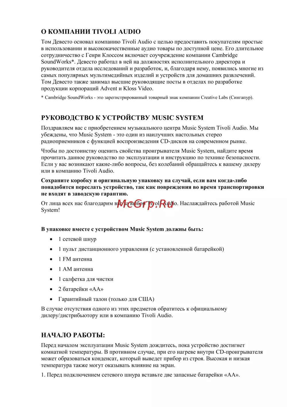Поздравляем вас с приобретением музыкального центра Music System Tivoli Audio. Мы