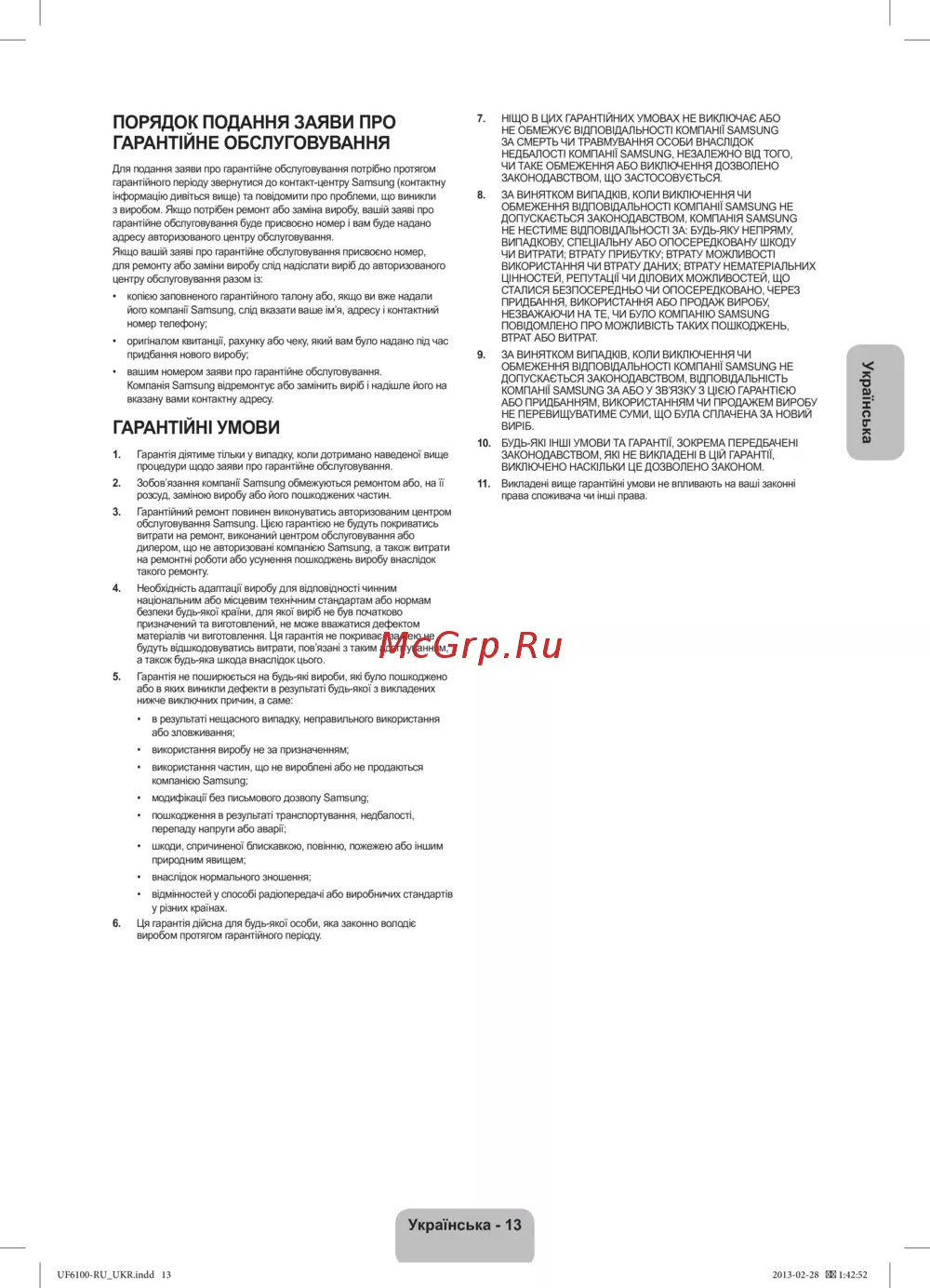 обслуговування Samsung. Цією гарантією не будуть покриватись