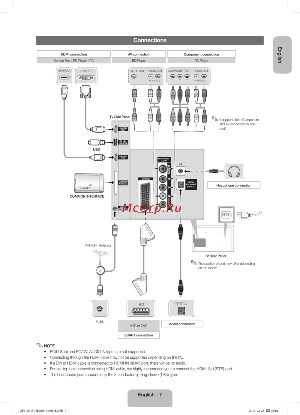 Samsung UE32F6100AK [7/81] Pc d sub and pc dvi audio in input are not supported connecting through the hdmi cable may not be supported depending on the pc if a dvi to hdmi cable is connected to hdmi in 2 dvi port there will be no audio for set top box connection using hdmi cable we highly recommend you to connect the hdmi in 1 stb port the headphone jack supports only the 3 conductor tip ring sleeve trs type