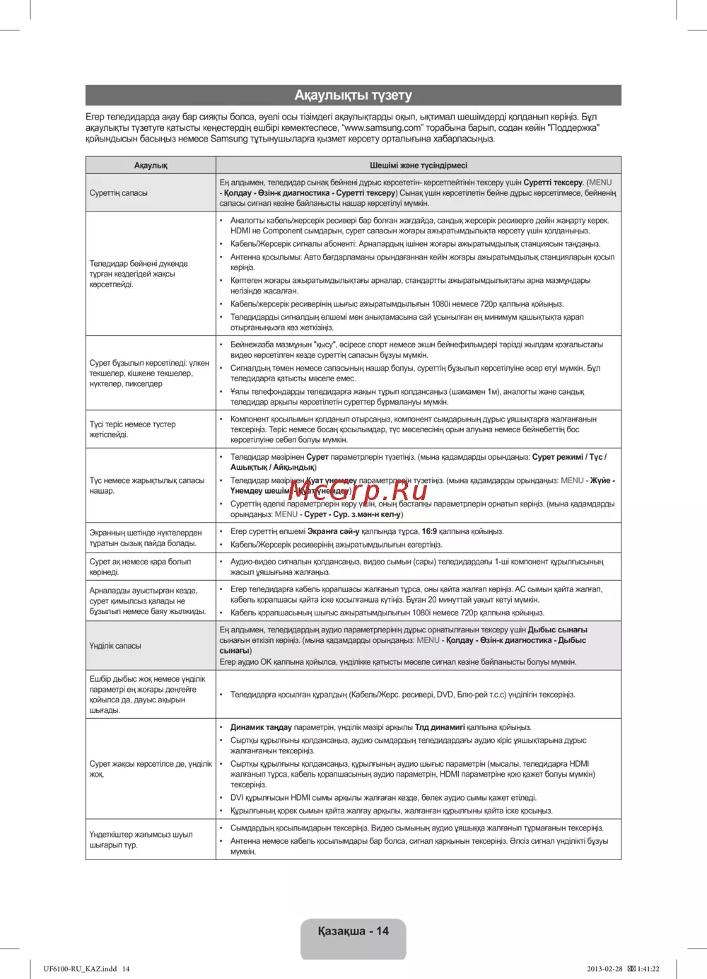 - Егер теледидарда ақау бар сияқты болса әуелі осы тізімдегі ақаулықтарды оқып ықтимал шешімдерді қолданып көріңіз бұл ақаулықты түзетуге қатысты кеңестердің ешбірі көмектеспесе www samsung com торабына барып содан кейін поддeржкa қойындысын басыңыз немесе samsung тұтынушыларға қызмет көрсету орталығына хабарласыңыз p.74