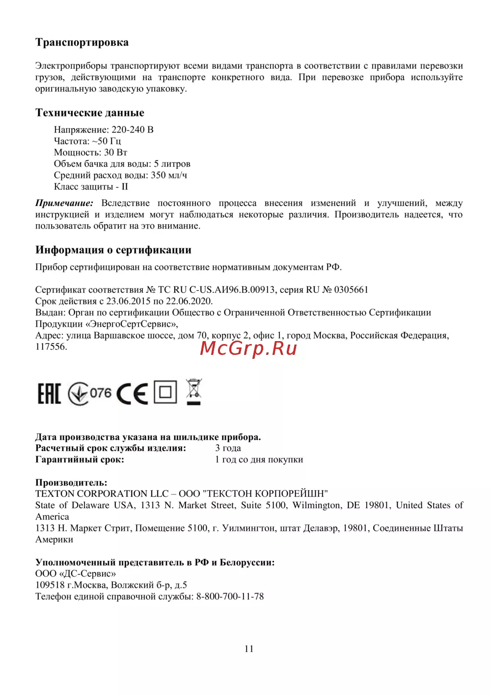 Транспортировка Электроприборы транспортируют всеми видами транспорта в соответствии с правилами перевозки грузов действующими на транспорте конкретного вида При перевозке прибора используйте оригинальную заводскую упаковку Технические данные Напряжение 220 240 В Частота 50 Гц Мощность 30 Вт Объем бачка для воды 5 литров Средний расход воды 350 мл ч Класс защиты II Примечание Вследствие постоянного процесса внесения изменений и улучшений между инструкцией и изделием могут наблюдаться некоторые различия Производитель надеется что пользователь обратит на это внимание Информапия о сертификации Прибор сертифицирован на соответствие нормативным документам РФ Сертификат соответствия ТС Ии С и8 АИ96 В ОО913 серия Ии 0305661 Срок действия с 23 06 2015 по 22 06 2020 Выдан Орган по сертификации Общество с Ограниченной Ответственностью Сертификации Продукции ЭнергоСертСервис Адрес улица Варшавское шоссе дом 70 корпус 2 офис 1 город Москва Российская Федерация 117556 ЕМ С И 5 Дата производства указана на шильдике прибора Расчетный срок службы изделия 3 года Гарантийный срок 1 год со дня покупки Производитель TEXTON CORPORATION LLC ООО ТЕКСТОН КОРПОРЕЙШН State of Delaware USA 1313 N Market Street Suite 5100 Wilmington DE 19801 United States of America 1313 H Маркет Стрит Помещение 5100 г Уилмингтон штат Делавэр 19801 Соединенные Штаты Америки Уполномоченный представитель в РФ и Белоруссии ООО Д С Сервис 109518 г Москва Волжский б р д 5 Телефон единой справочной службы 8 800 700 11 78 11