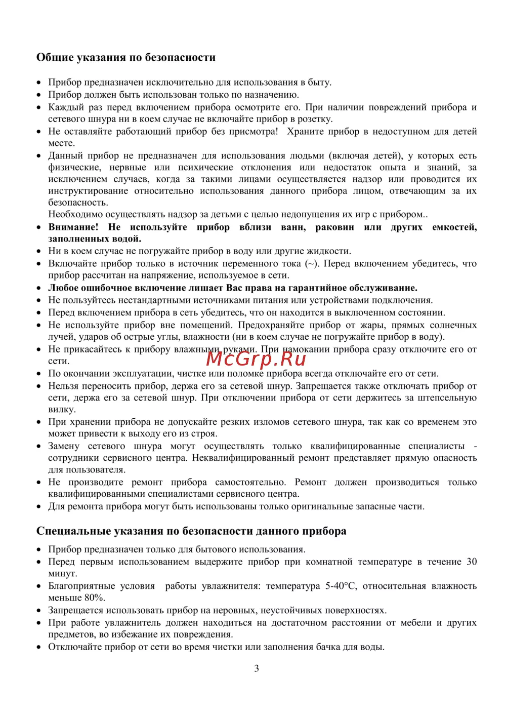 Общие указания по безопасности Прибор предназначен исключительно для использования в быту Прибор должен быть использован только по назначению Каждый раз перед включением прибора осмотрите его При наличии повреждений прибора и сетевого шнура ни в коем случае не включайте прибор в розетку Не оставляйте работающий прибор без присмотра Храните прибор в недоступном для детей месте Данный прибор не предназначен для использования людьми включая детей у которых есть физические нервные или психические отклонения или недостаток опыта и знаний за исключением случаев когда за такими лицами осуществляется надзор или проводится их инструктирование относительно использования данного прибора лицом отвечающим за их безопасность Необходимо осуществлять надзор за детьми с целью недопущения их игр с прибором Внимание Не используйте прибор вблизи ванн раковин или других емкостей заполненных водой Ни в коем случае не погружайте прибор в воду или другие жидкости Включайте прибор только в источник переменного тока Перед включением убедитесь что прибор рассчитан на напряжение используемое в сети Любое ошибочное включение лишает Вас права на гарантийное обслуживание Не пользуйтесь нестандартными источниками питания или устройствами подключения Перед включением прибора в сеть убедитесь что он находится в выключенном состоянии Не используйте прибор вне помещений Предохраняйте прибор от жары прямых солнечных лучей ударов об острые углы влажности ни в коем случае не погружайте прибор в воду Не прикасайтесь к прибору влажными руками При намокании прибора сразу отключите его от сети По окончании эксплуатации чистке или поломке прибора всегда отключайте его от сети Нельзя переносить прибор держа его за сетевой шнур Запрещается также отключать прибор от сети держа его за сетевой шнур При отключении прибора от сети держитесь за штепсельную вилку При хранении прибора не допускайте резких изломов сетевого шнура так как со временем это может привести к выходу его из строя Замену сетевого шнура могут осуществлять только квалифицированные специалисты сотрудники сервисного центра Неквалифицированный ремонт представляет прямую опасность для пользователя Не производите ремонт прибора самостоятельно Ремонт должен производиться только квалифицированными специалистами сервисного центра Для ремонта прибора могут быть использованы только оригинальные запасные части Специальные указания по безопасности данного прибора Прибор предназначен только для бытового использования Перед первым использованием выдержите прибор при комнатной температуре в течение 30 минут Благоприятные условия работы увлажнителя температура 5 40 С относительная влажность меньше 80 Запрещается использовать прибор на неровных неустойчивых поверхностях При работе увлажнитель должен находиться на достаточном расстоянии от мебели и других предметов во избежание их повреждения Отключайте прибор от сети во время чистки или заполнения бачка для воды 3