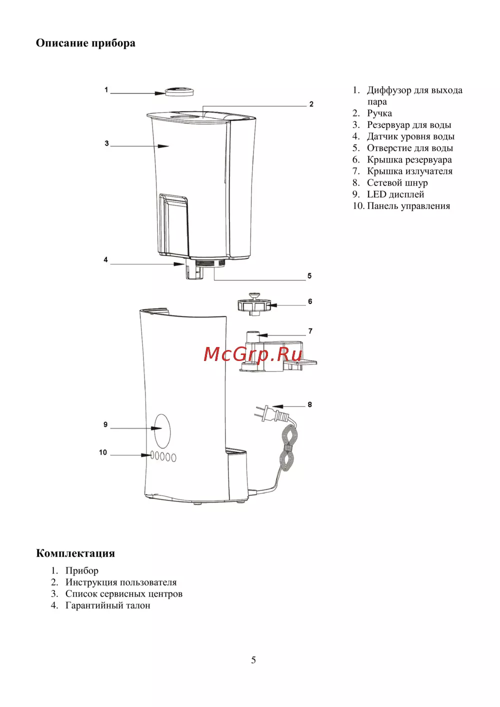 Описание прибора 1 Диффузор для выхода пара 2 Ручка 3 Резервуар для воды 4 Датчик уровня воды 5 Отверстие для воды 6 Крышка резервуара 7 Крышка излучателя 8 Сетевой шнур 9 LED дисплей 10 Панель управления Комплектация 1 Прибор 2 Инструкция пользователя 3 Список сервисных центров 4 Гарантийный талон 5