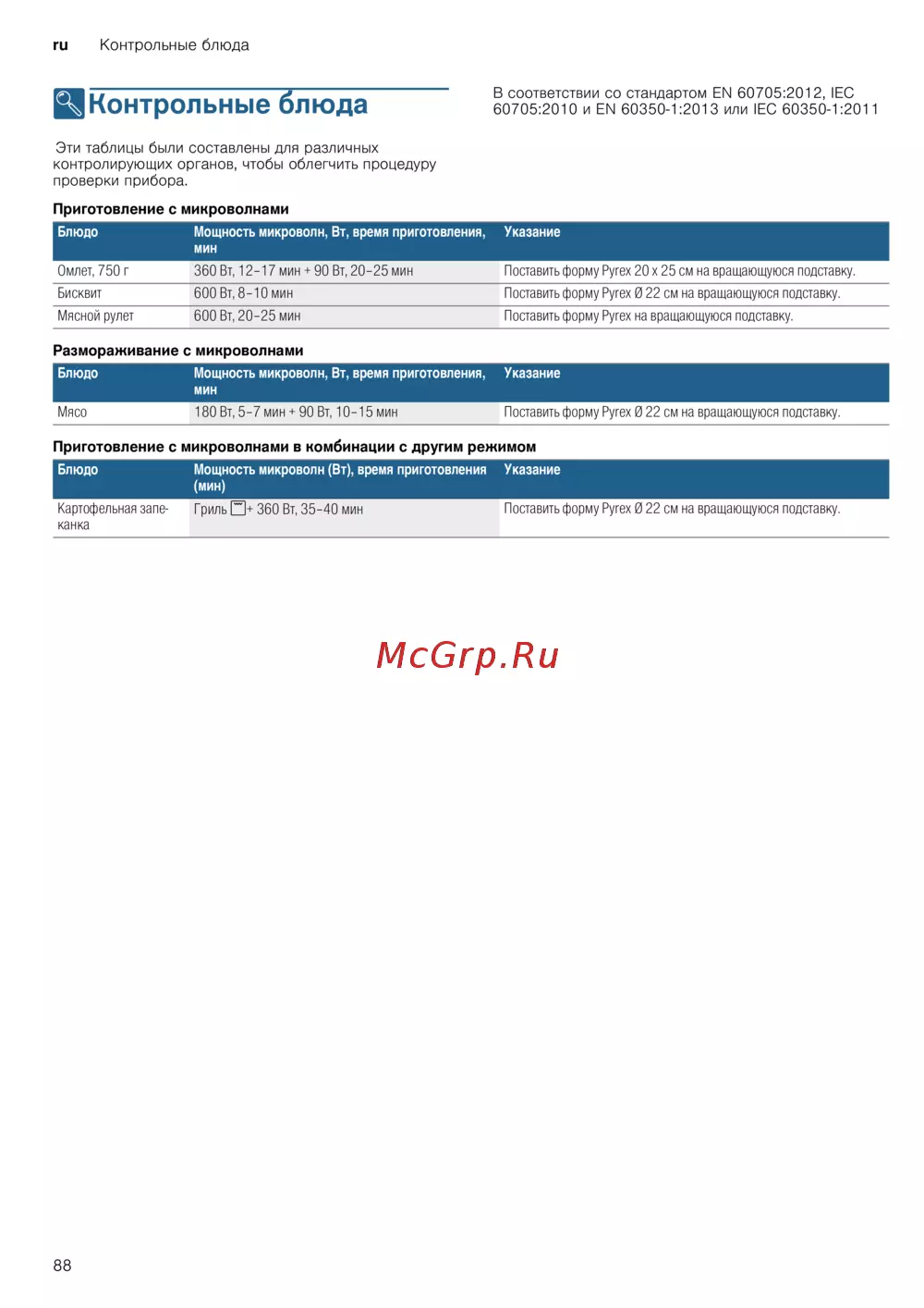 Узнайте о контрольных блюдах для проверки микроволновых приборов. Подробные таблицы с мощностью и временем приготовления для различных блюд.