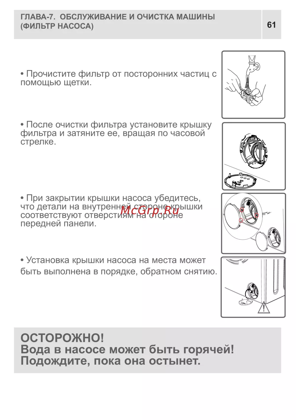 - Осторожно вода в насосе может быть горячей подождите пока она остынет p.61