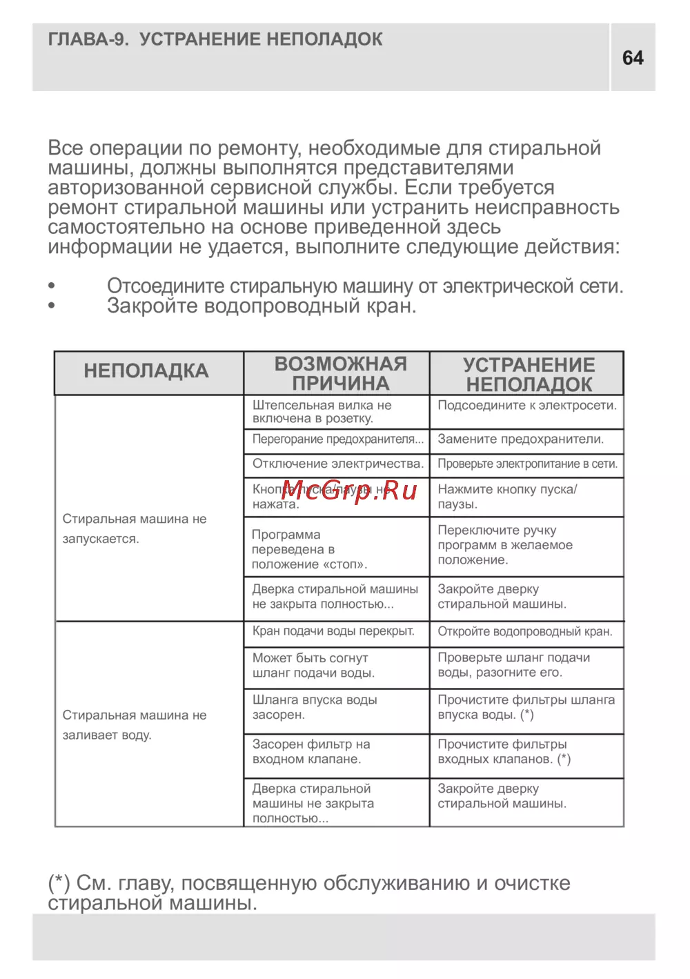 - Все операции по ремонту необходимые для стиральной машины должны выполнятся представителями авторизованной сервисной службы если требуется ремонт стиральной машины или устранить неисправность самостоятельно на основе приведенной здесь информации не удается выполните следующие действия p.64