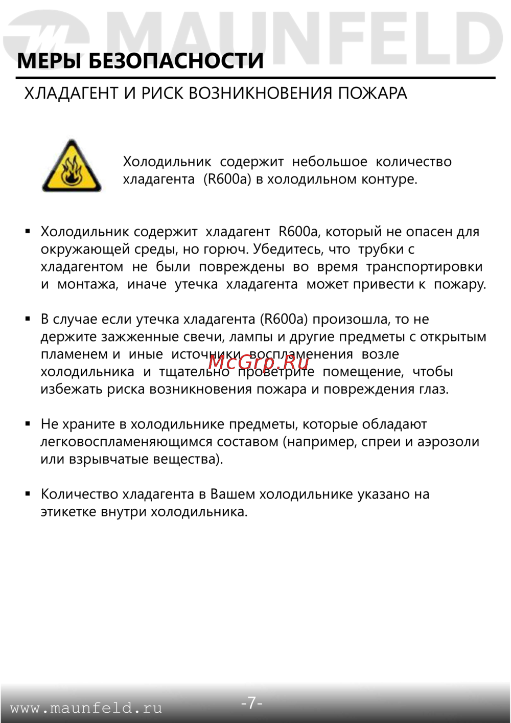 Maunfeld MFF182NFW [8/45] Хладагент и риск возникновения пожара