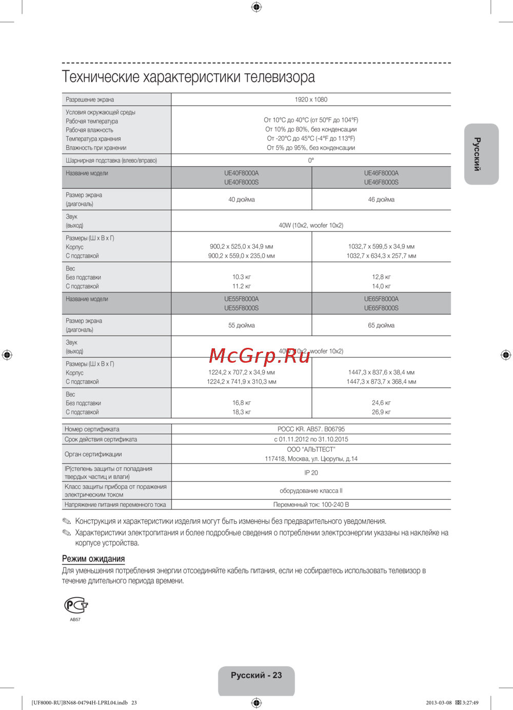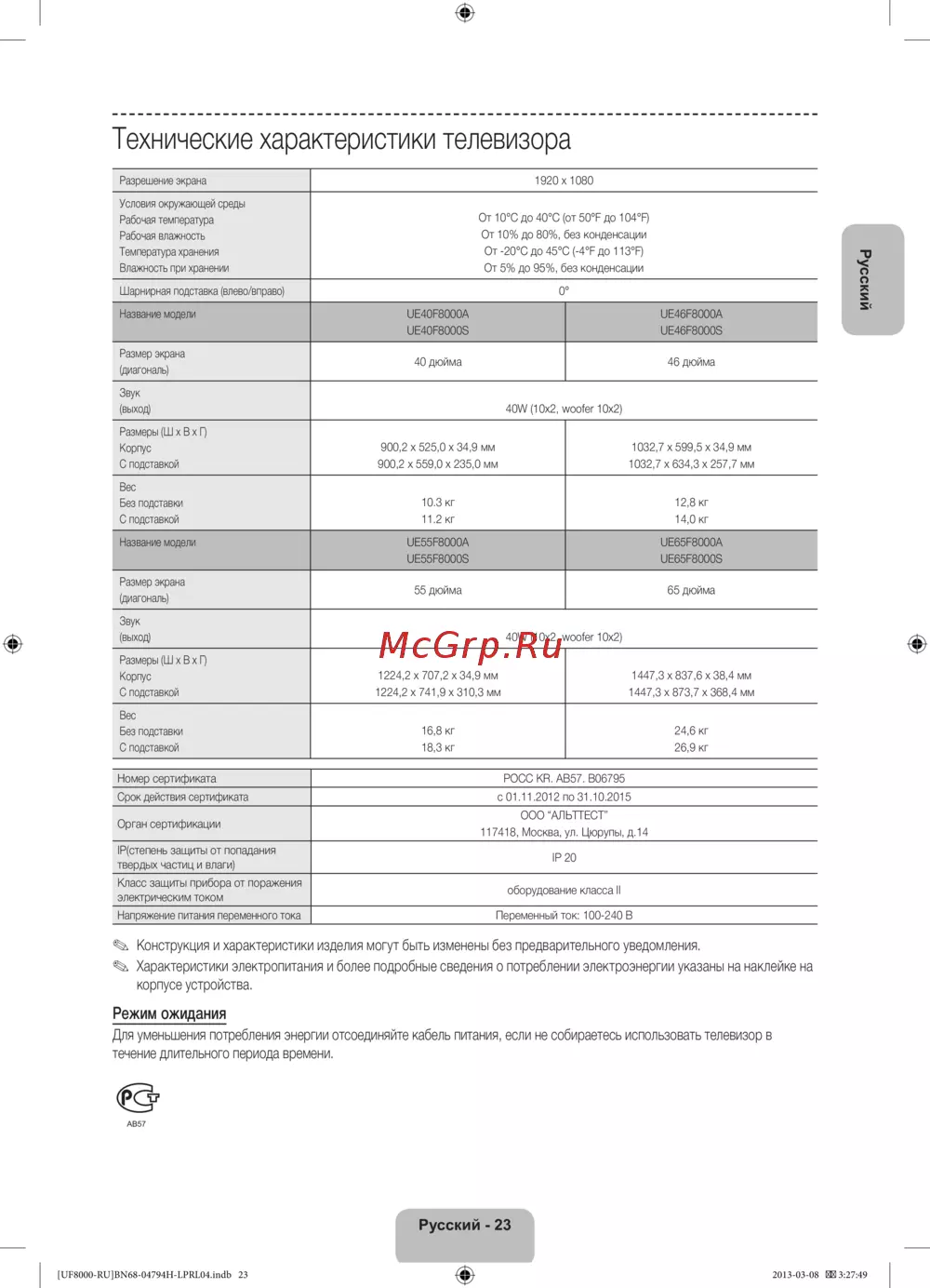 Samsung UE55F8000AT — технические характеристики телевизоров с различными размерами экранов [23/24]