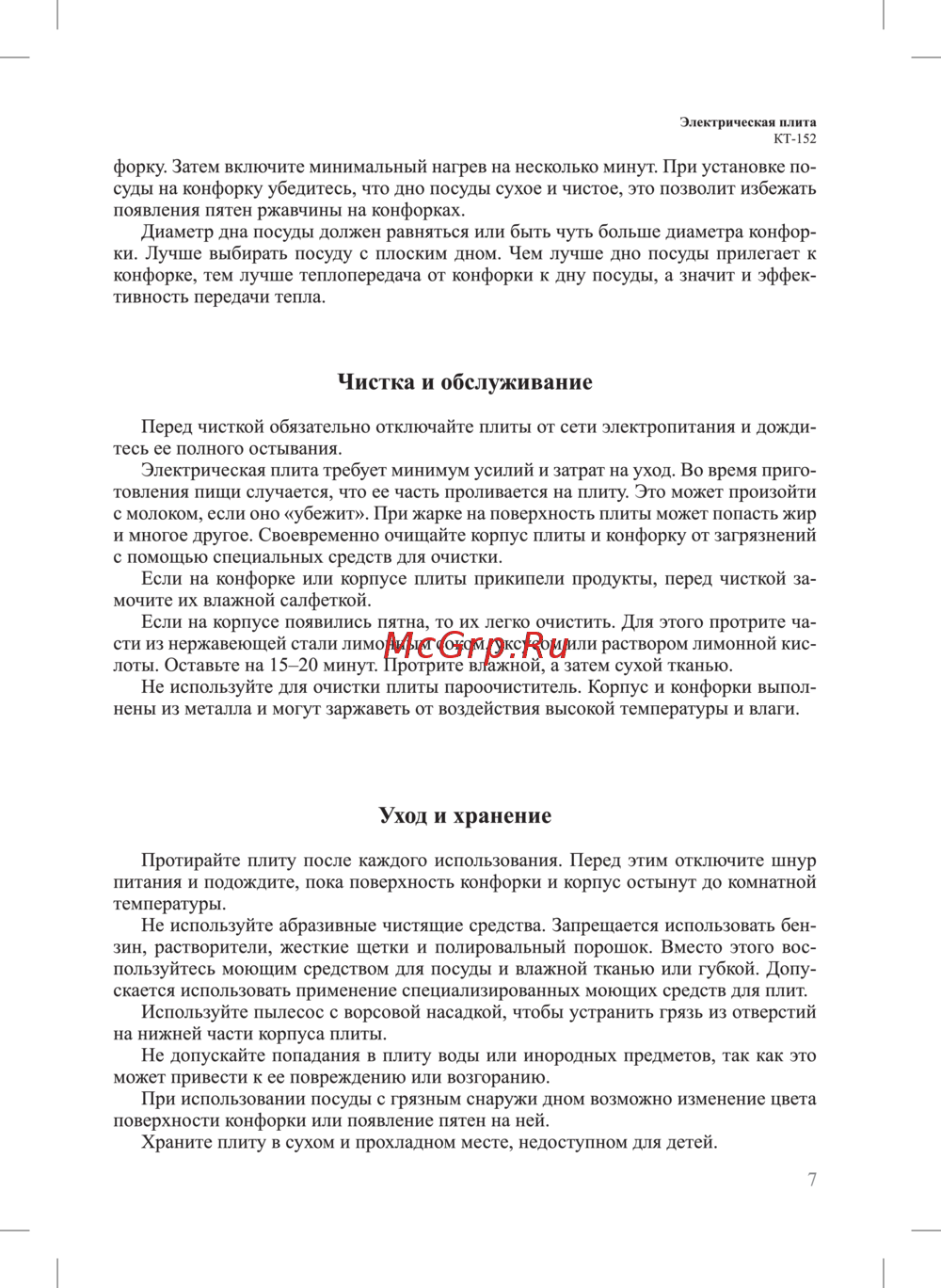 Электрическая плита КТ 152 форку Затем включите минимальный нагрев на несколько минут При установке по суды на конфорку убедитесь что дно посуды сухое и чистое это позволит избежать появления пятен ржавчины на конфорках Диаметр дна посуды должен равняться или быть чуть больше диаметра конфор ки Лучше выбирать посуду с плоским дном Чем лучше дно посуды прилегает к конфорке тем лучше теплопередача от конфорки к дну посуды а значит и эффек тивность передачи тепла Чистка и обслуживание Перед чисткой обязательно отключайте плиты от сети электропитания и дожди тесь ее полного остывания Электрическая плита требует минимум усилий и затрат на уход Во время приго товления пищи случается что ее часть проливается на плиту Это может произойти с молоком если оно убежит При жарке на поверхность плиты может попасть жир и многое другое Своевременно очищайте корпус плиты и конфорку от загрязнений с помощью специальных средств для очистки Если на конфорке или корпусе плиты прикипели продукты перед чисткой за мочите их влажной салфеткой Если на корпусе появились пятна то их легко очистить Для этого протрите ча сти из нержавеющей стали лимонным соком уксусом или раствором лимонной кис лоты Оставьте на 15 20 минут Протрите влажной а затем сухой тканью Не используйте для очистки плиты пароочиститель Корпус и конфорки выпол нены из металла и могут заржаветь от воздействия высокой температуры и влаги Уход и хранение Протирайте плиту после каждого использования Перед этим отключите шнур питания и подождите пока поверхность конфорки и корпус остынут до комнатной температуры Не используйте абразивные чистящие средства Запрещается использовать бен зин растворители жесткие щетки и полировальный порошок Вместо этого вос пользуйтесь моющим средством для посуды и влажной тканью или губкой Допу скается использовать применение специализированных моющих средств для плит Используйте пылесос с ворсовой насадкой чтобы устранить грязь из отверстий на нижней части корпуса плиты Не допускайте попадания в плиту воды или инородных предметов так как это может привести к ее повреждению или возгоранию При использовании посуды с грязным снаружи дном возможно изменение цвета поверхности конфорки или появление пятен на ней Храните плиту в сухом и прохладном месте недоступном для детей 7