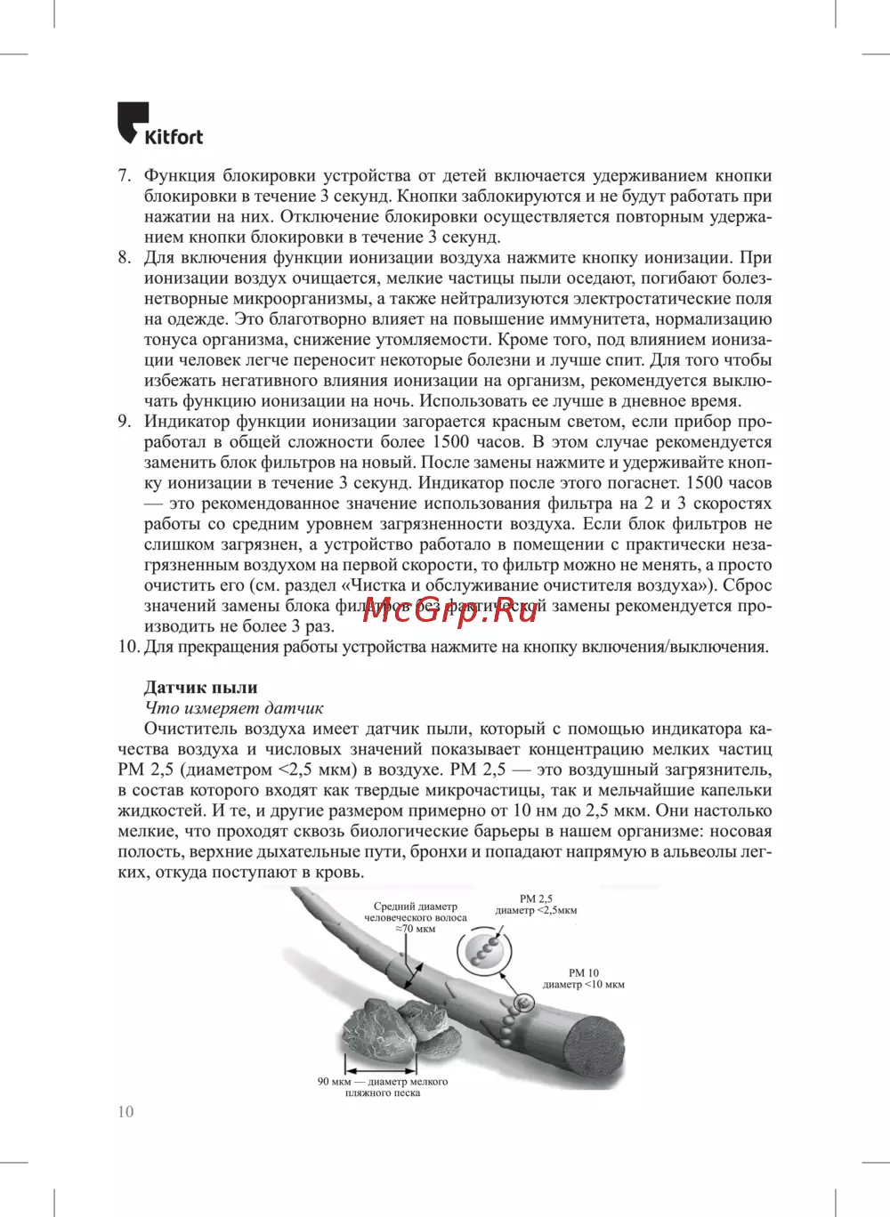 Kitfort 7 Функция блокировки устройства от детей включается удерживанием кнопки блокировки в течение 3 секунд Кнопки заблокируются и не будут работать при нажатии на них Отключение блокировки осуществляется повторным удержа нием кнопки блокировки в течение 3 секунд 8 Для включения функции ионизации воздуха нажмите кнопку ионизации При ионизации воздух очищается мелкие частицы пыли оседают погибают болез нетворные микроорганизмы а также нейтрализуются электростатические поля на одежде Это благотворно влияет на повышение иммунитета нормализацию тонуса организма снижение утомляемости Кроме того под влиянием иониза ции человек легче переносит некоторые болезни и лучше спит Для того чтобы избежать негативного влияния ионизации на организм рекомендуется выклю чать функцию ионизации на ночь Использовать ее лучше в дневное время 9 Индикатор функции ионизации загорается красным светом если прибор про работал в общей сложности более 1500 часов В этом случае рекомендуется заменить блок фильтров на новый После замены нажмите и удерживайте кноп ку ионизации в течение 3 секунд Индикатор после этого погаснет 1500 часов это рекомендованное значение использования фильтра на 2 и 3 скоростях работы со средним уровнем загрязненности воздуха Если блок фильтров не слишком загрязнен а устройство работало в помещении с практически неза грязненным воздухом на первой скорости то фильтр можно не менять а просто очистить его см раздел Чистка и обслуживание очистителя воздуха Сброс значений замены блока фильтров без фактической замены рекомендуется про изводить не более 3 раз 10 Для прекращения работы устройства нажмите на кнопку включения выключения Датчик пыли Что измеряет датчик Очиститель воздуха имеет датчик пыли который с помощью индикатора ка чества воздуха и числовых значений показывает концентрацию мелких частиц РМ 2 5 диаметром 2 5 мкм в воздухе РМ 2 5 это воздушный загрязнитель в состав которого входят как твердые микрочастицы так и мельчайшие капельки жидкостей И те и другие размером примерно от 10 нм до 2 5 мкм Они настолько мелкие что проходят сквозь биологические барьеры в нашем организме носовая полость верхние дыхательные пути бронхи и попадают напрямую в альвеолы лег ких откуда поступают в кровь 10