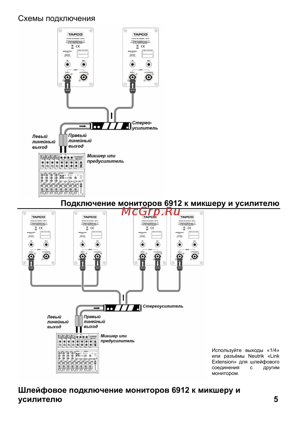 - Подключение мониторов 6912 к микшеру и усилителю p.5