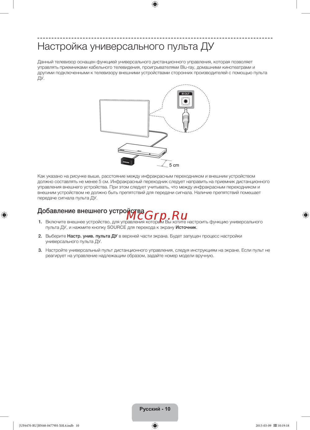 должно составлять не менее 5 см. Инфракрасный переходник следует направить на приемник дистанционного