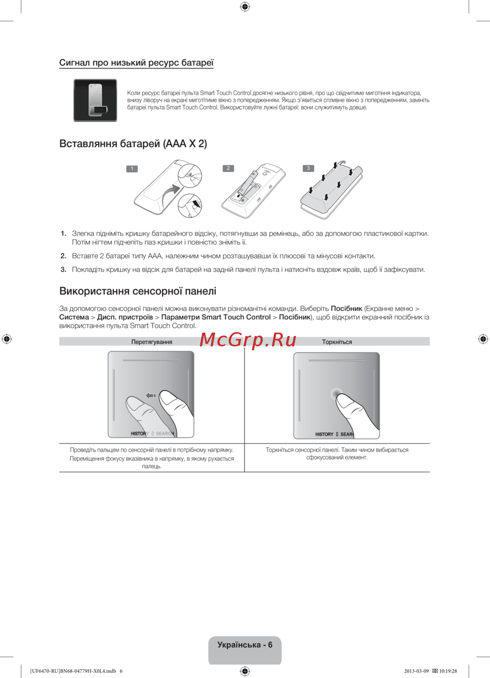 Дізнайтеся, як замінити батареї та користуватися сенсорною панеллю пульта Smart Touch Control. Легкі кроки для оптимального використання пристрою.