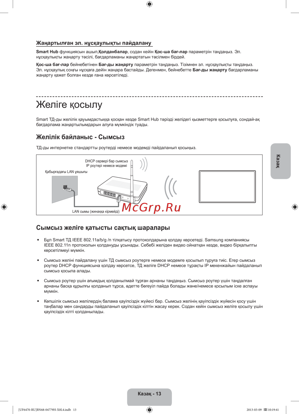 • Бұл Smart ТД IEEE 802.11a/b/g /n тілқатысу протоколдарына қолдау көрсетеді. Samsung компаниясы