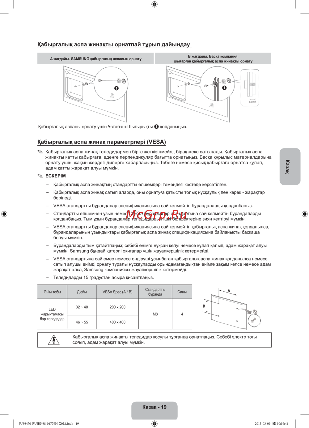 Samsung UE55F6800AB — қабырғалық аспа жинағын орнату: Нұсқаулық және қауіпсіздік ережелері [91/97]