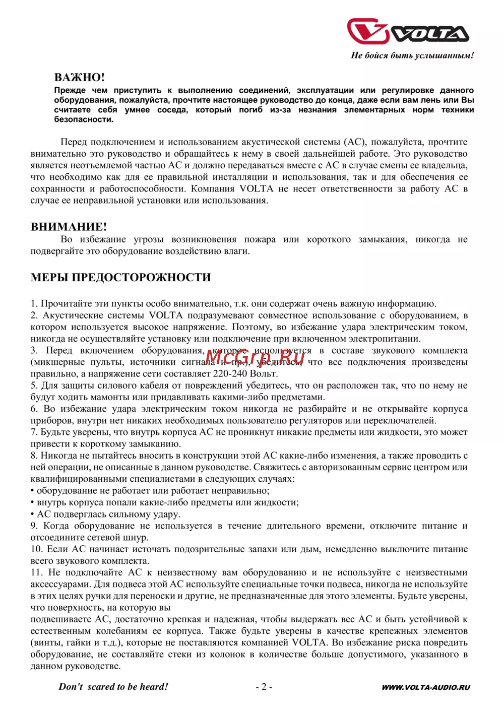 2. Акустические системы VOLTA подразумевают совместное использование с оборудованием, в