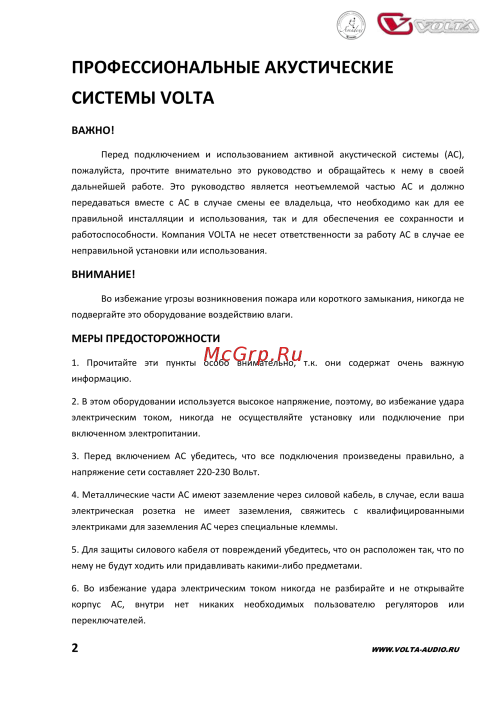 работоспособности. Компания VOLTA не несет ответственности за работу АС в случае ее