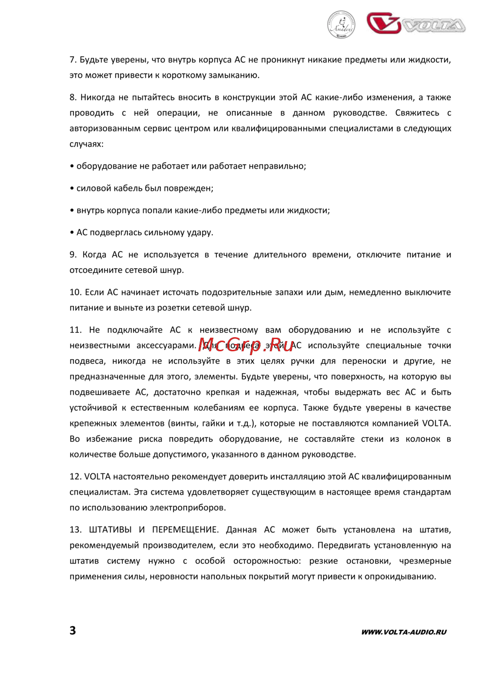 12. VOLTA настоятельно рекомендует доверить инсталляцию этой АС квалифицированным