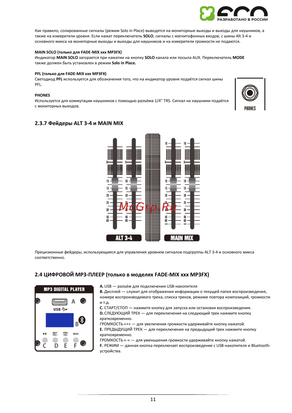 2.4 ЦИФРОВОЙ MP3-ПЛЕЕР (только в моделях FADE-MIX xxx MP3FX)