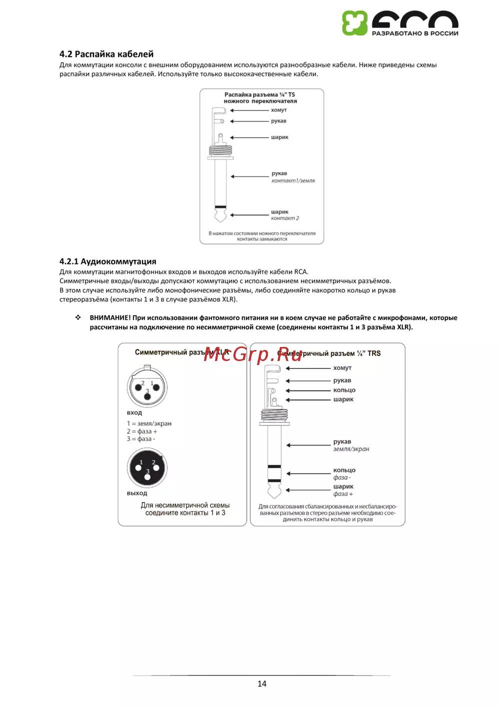 ВНИМАНИЕ! При использовании фантомного питания ни в коем случае не работайте с микрофонами, которые