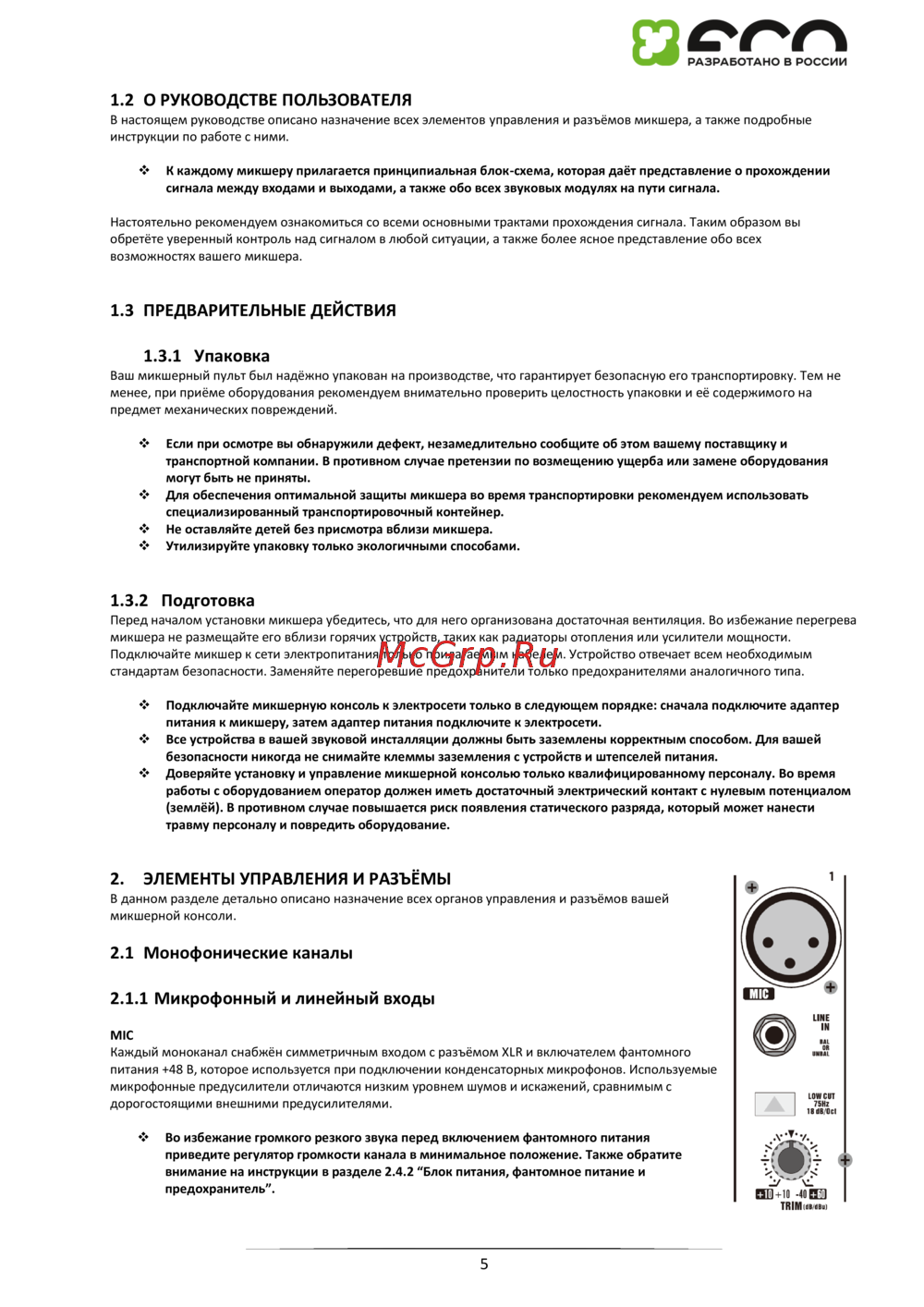 - Монофонические каналы 2 микрофонный и линейный входы p.5