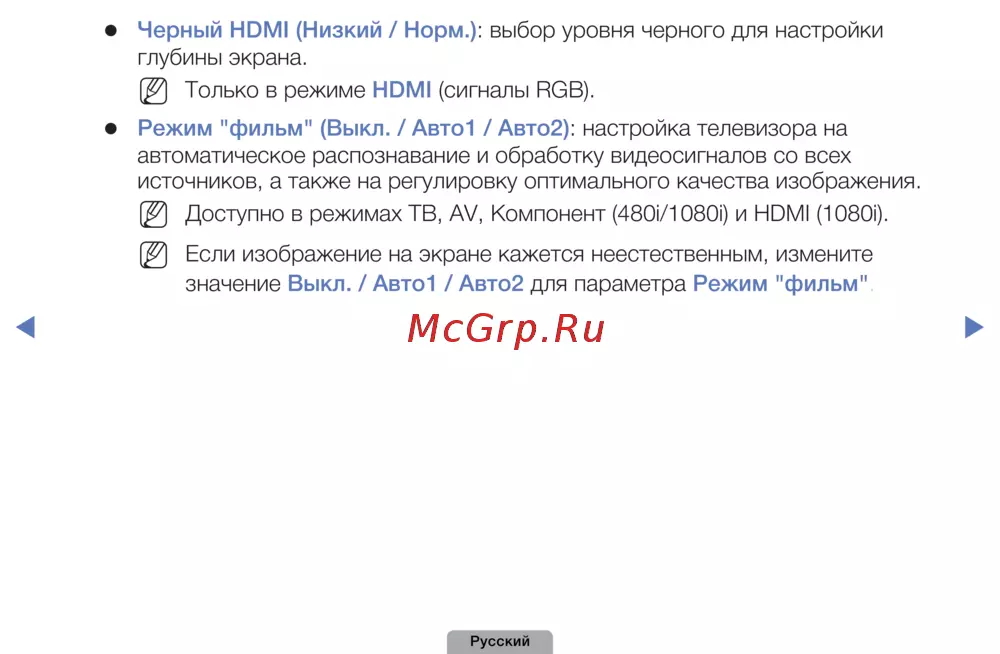 Режим❑"фильм"❑(Выкл.❑/❑Авто1❑/❑Авто2): настройка телевизора на