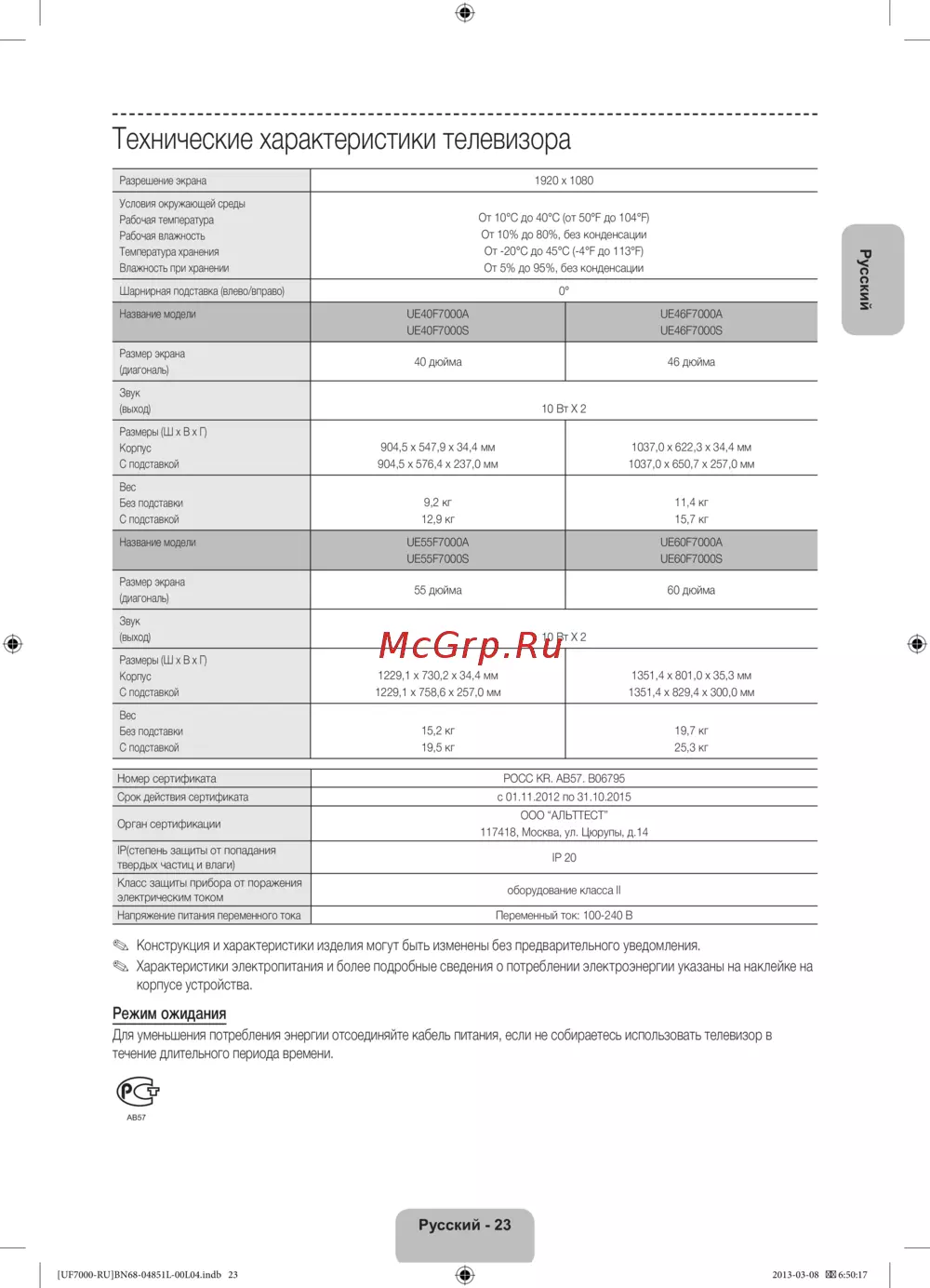 Samsung UE60F7000AT [23/24] Технические характеристики телевизора
