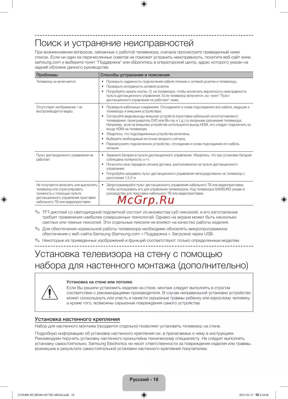 - Установка телевизора на стену с помощью набора для настенного монтажа дополнительно p.18