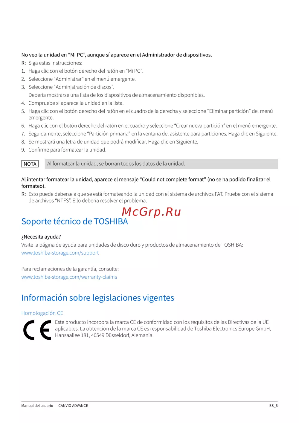 Toshiba Canvio Advance HDTCA10ER3AA [39/185] Soporte técnico de toshiba