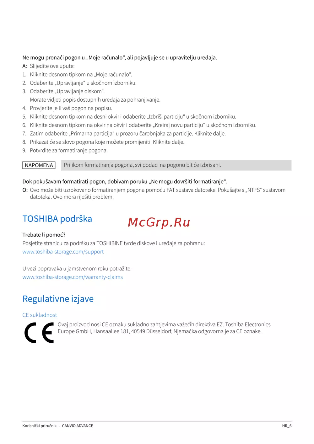 Posjetite stranicu za podršku za TOSHIBINE tvrde diskove i uređaje za pohranu: