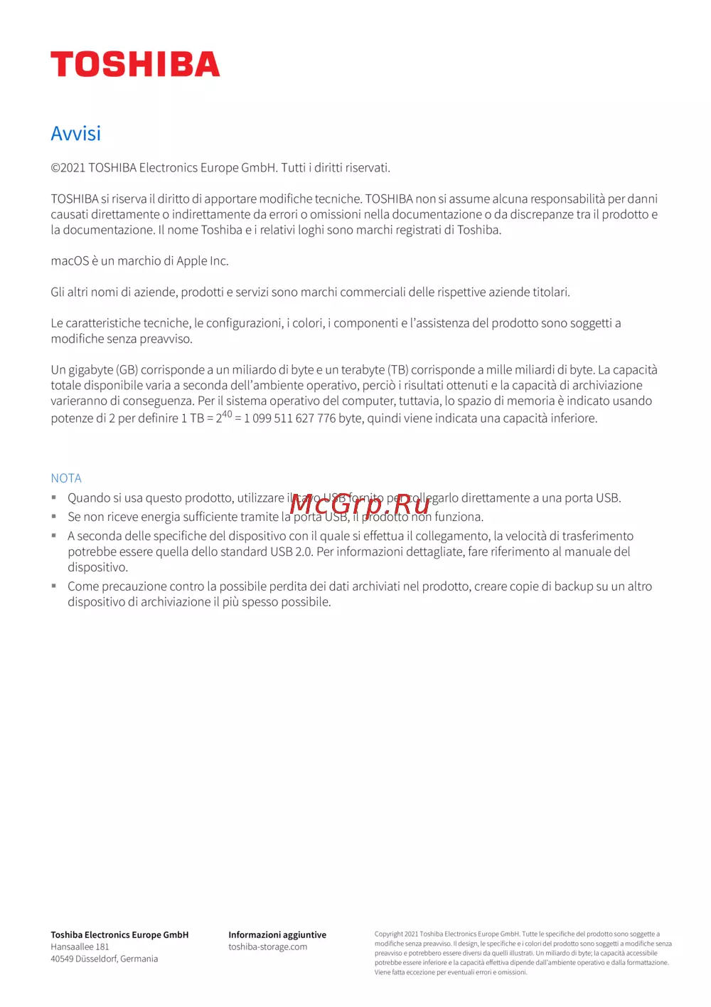 opyright 2021 Toshiba Electronics Europe GmbH. Tutte le specifiche del prodotto sono soggette a