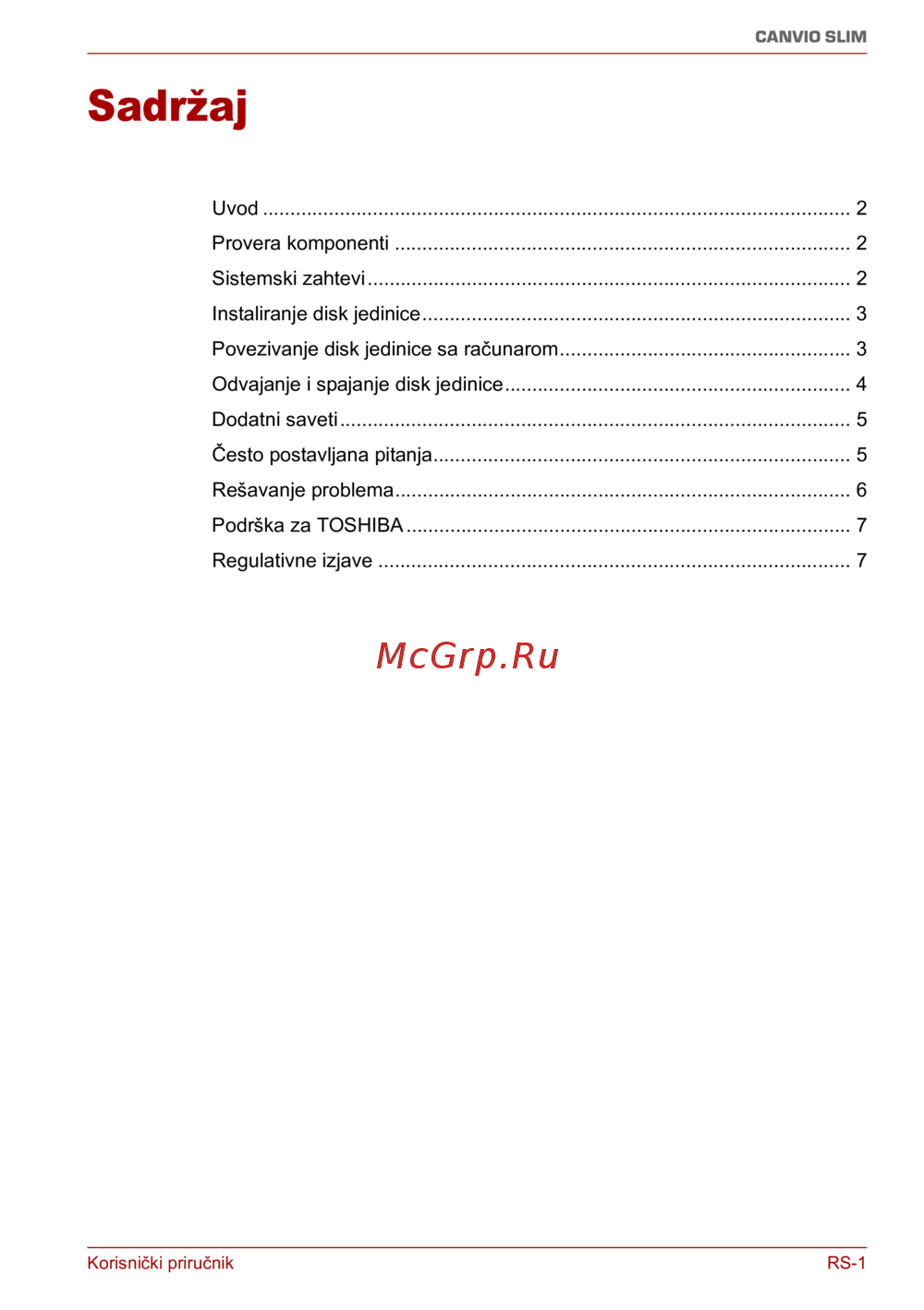 Podrška za TOSHIBA................................................................................. 7