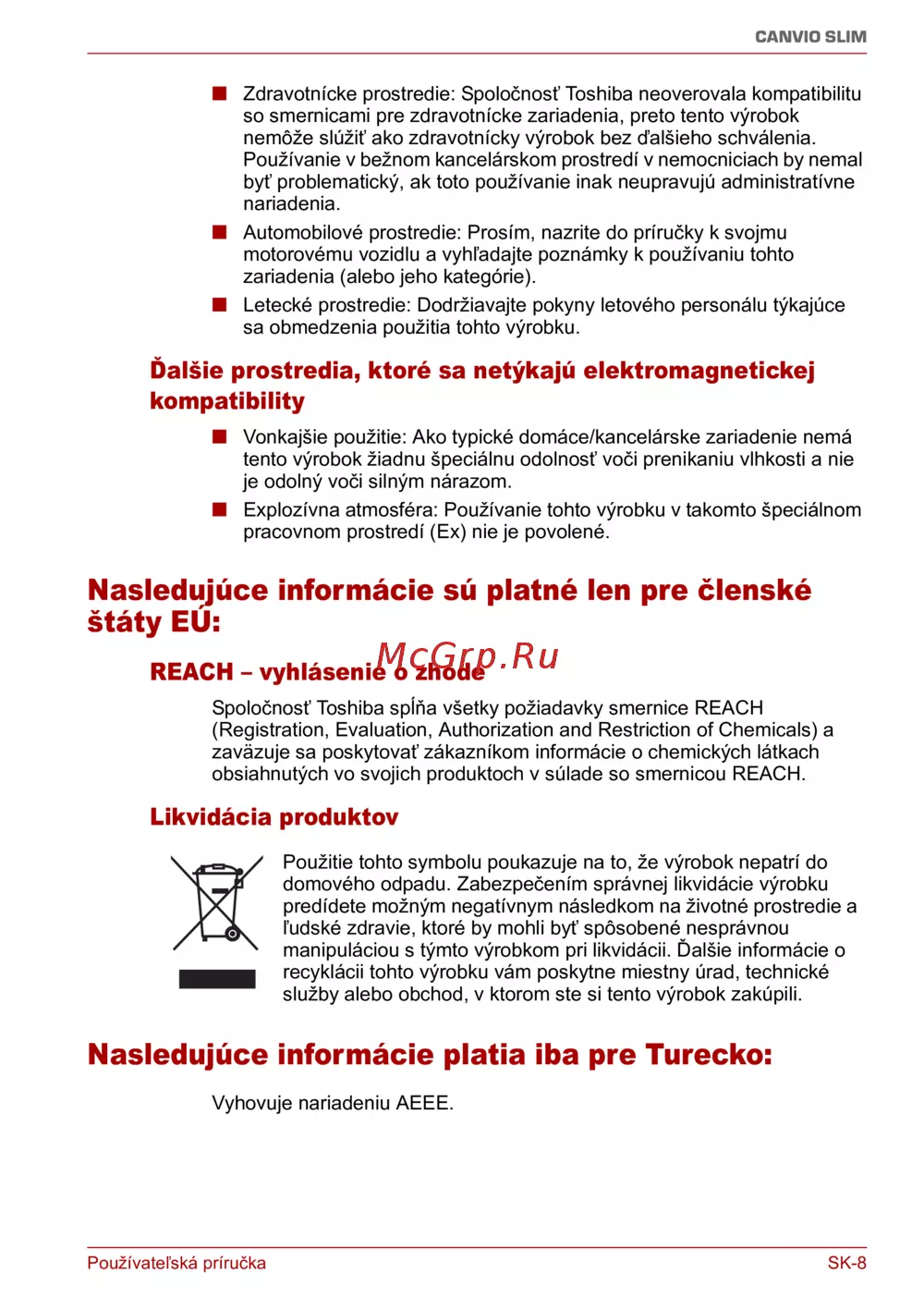 Toshiba Canvio Slim HDTD310EK3DA [173/201] Ďalšie prostredia ktoré sa netýkajú elektromagnetickej kompatibility