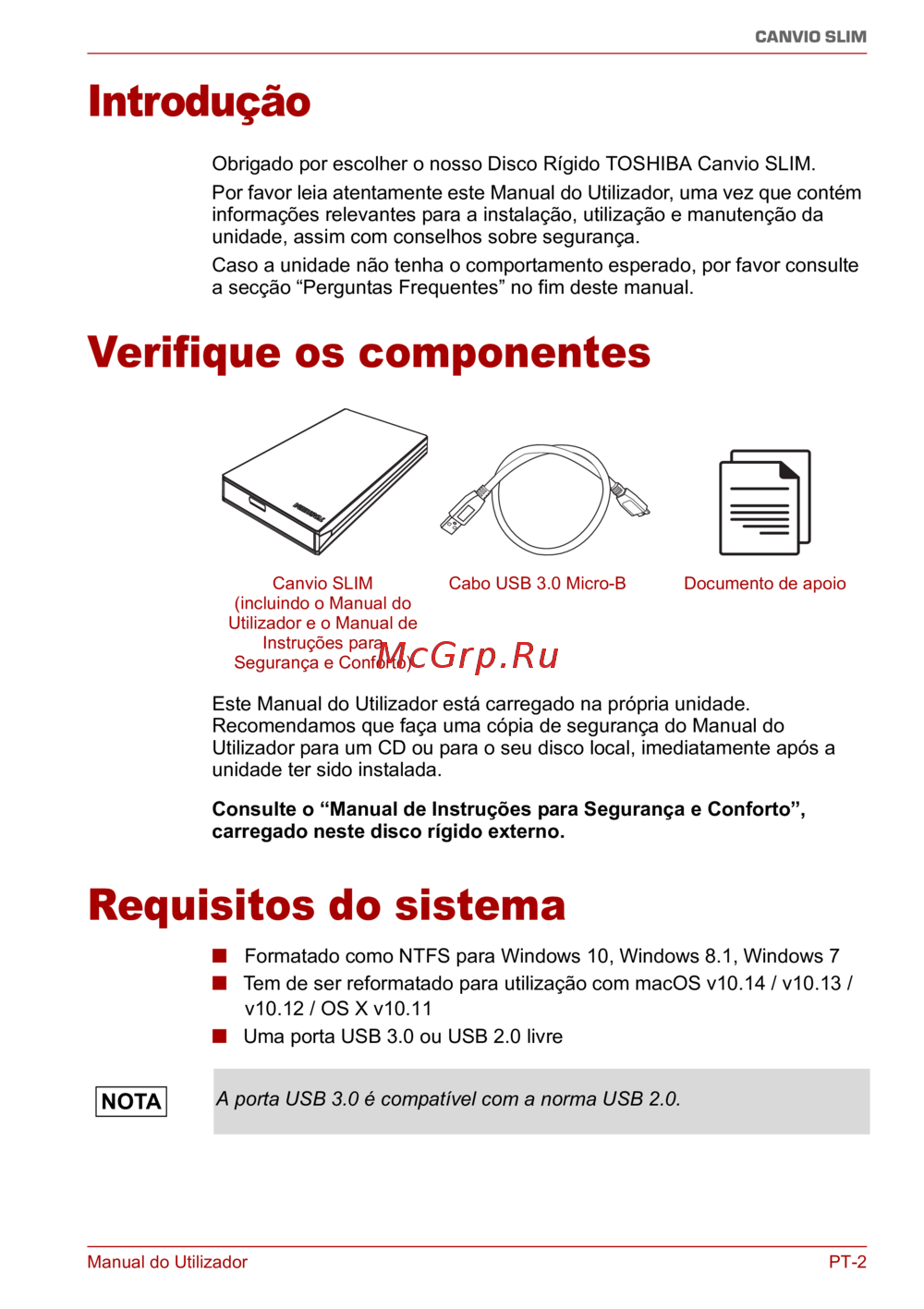 Obrigado por escolher o nosso Disco Rígido TOSHIBA Canvio SLIM.