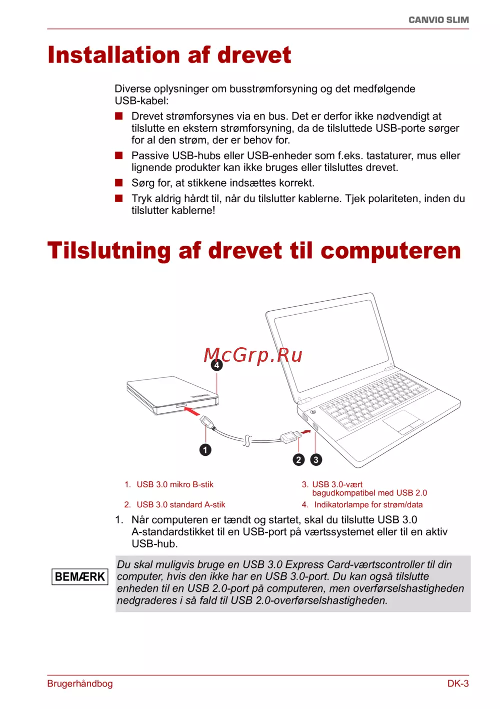 1. USB 3.0 mikro B-stik 3. USB 3.0-vært