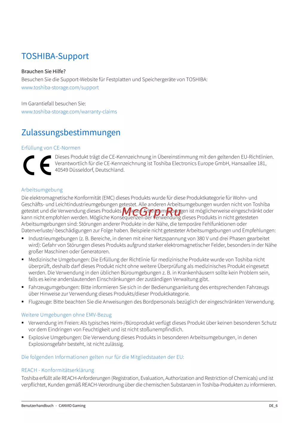 Verantwortlich für die CE-Kennzeichnung ist Toshiba Electronics Europe GmbH, Hansaallee 181,