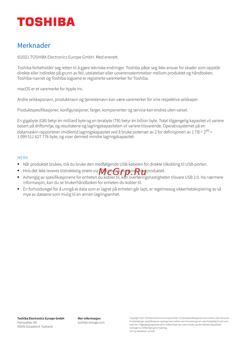 Toshiba forbeholder seg retten til å gjøre tekniske endringer. Toshiba påtar seg ikke ansvar for skader som oppstår