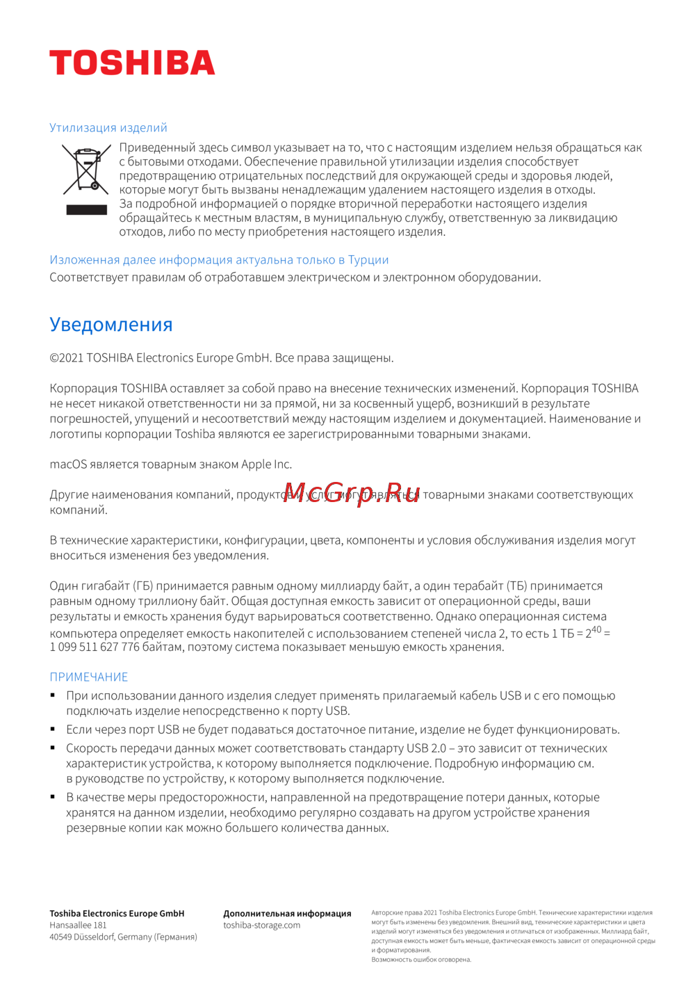 Toshiba Canvio Slim HDTD310EK3DAИнструкция по эксплуатации -