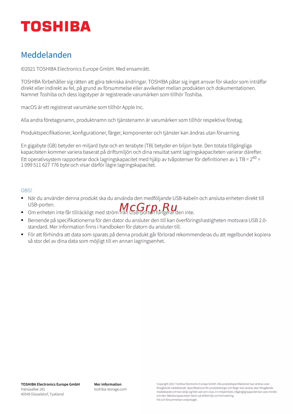 TOSHIBA förbehåller sig rätten att göra tekniska ändringar. TOSHIBA påtar sig inget ansvar för skador som inträffar