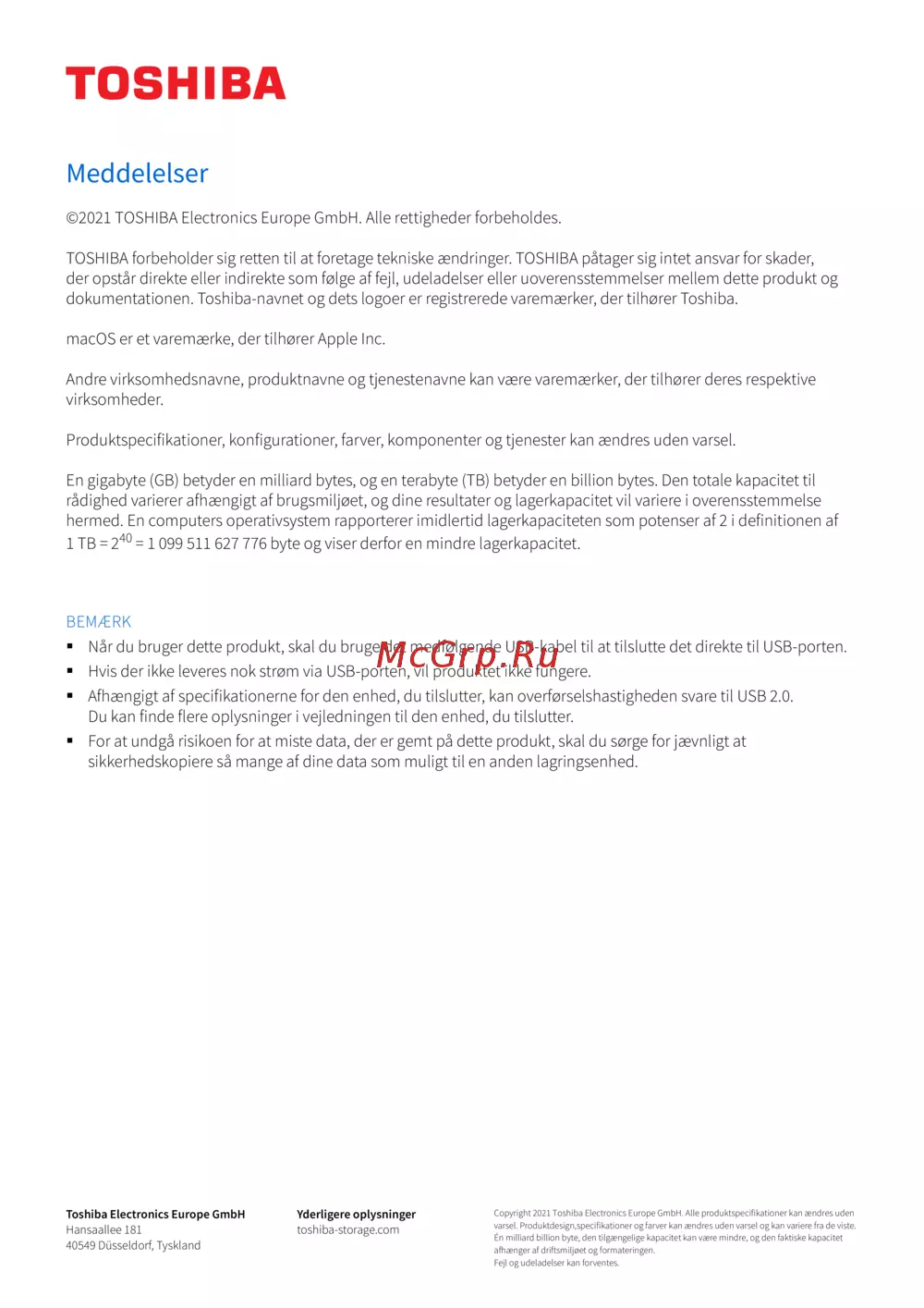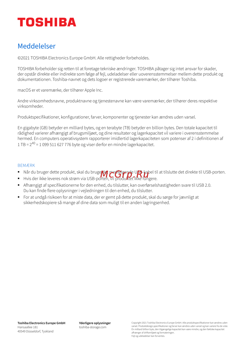 opyright 2021 Toshiba Electronics Europe GmbH. Alle produktspecifikationer kan ændres uden