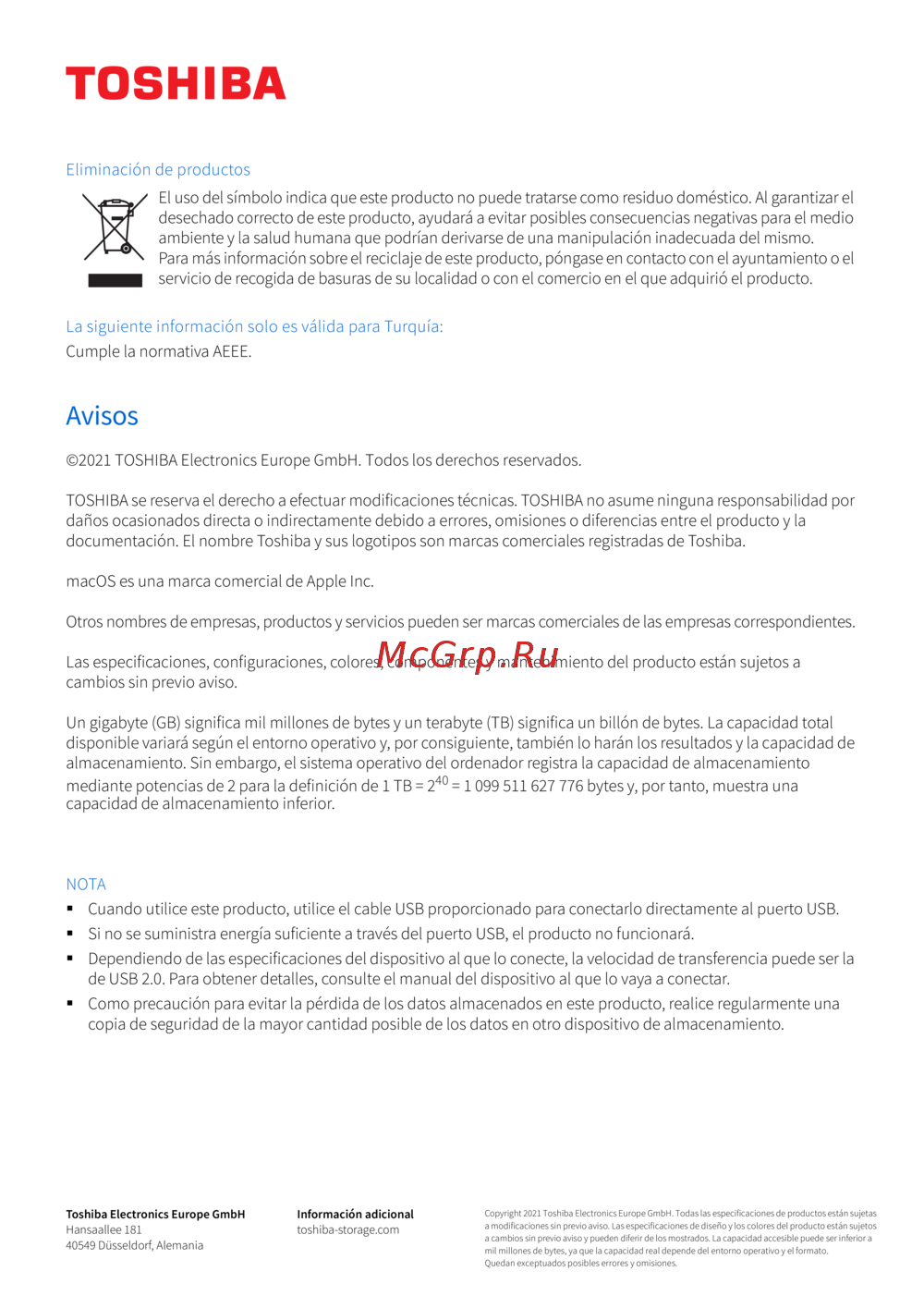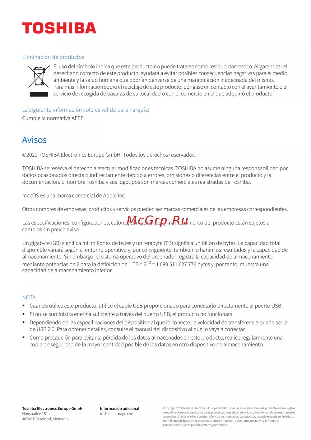 opyright 2021 Toshiba Electronics Europe GmbH. Todas las especificaciones de productos están sujetas