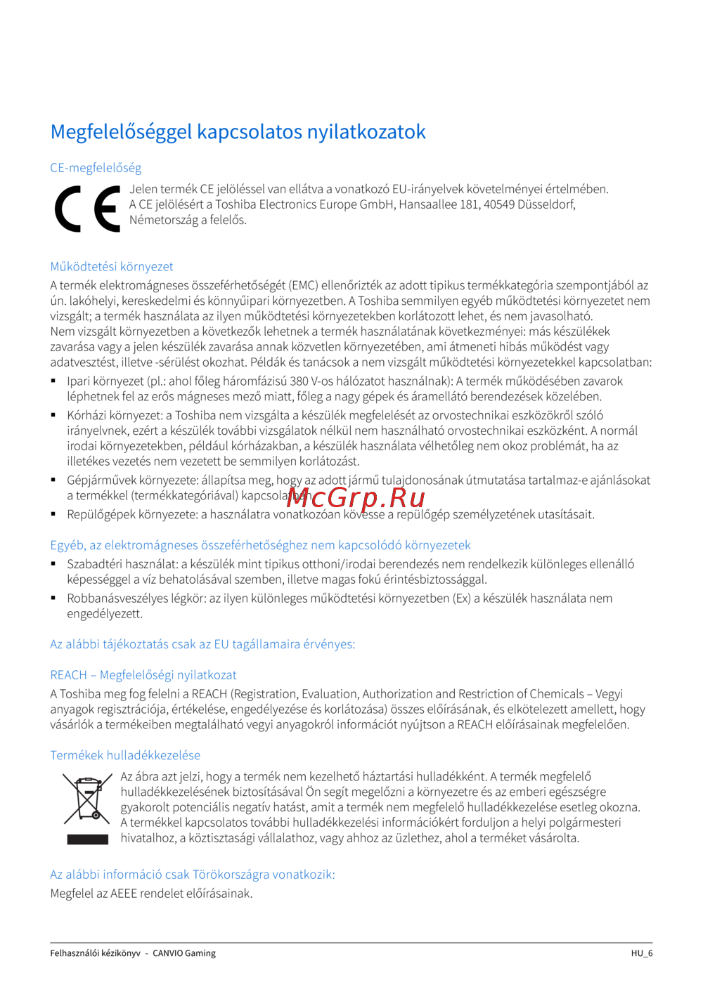 A CE jelölésért a Toshiba Electronics Europe GmbH, Hansaallee 181, 40549 Düsseldorf,