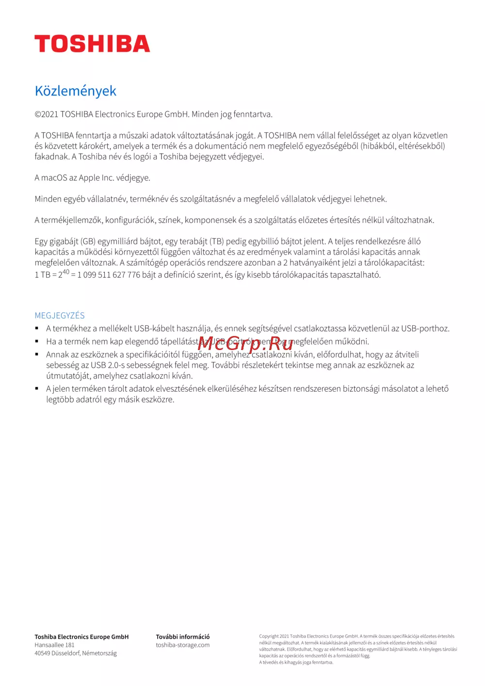 opyright 2021 Toshiba Electronics Europe GmbH. A termék összes specifikációja előzetes értesítés