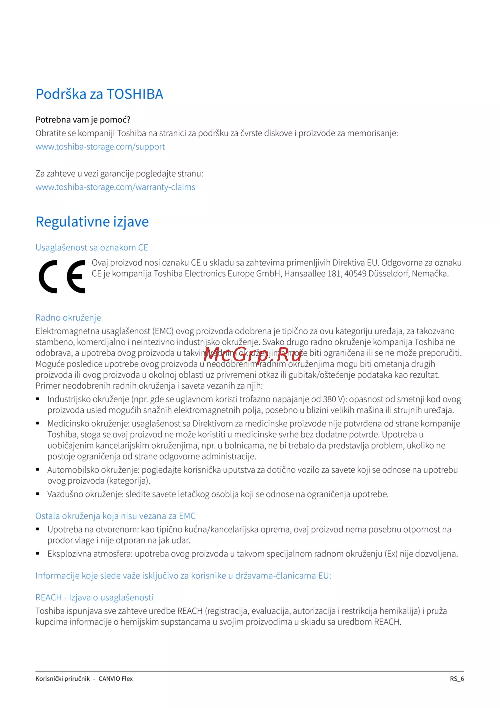 CE je kompanija Toshiba Electronics Europe GmbH, Hansaallee 181, 40549 Düsseldorf, Nemačka.